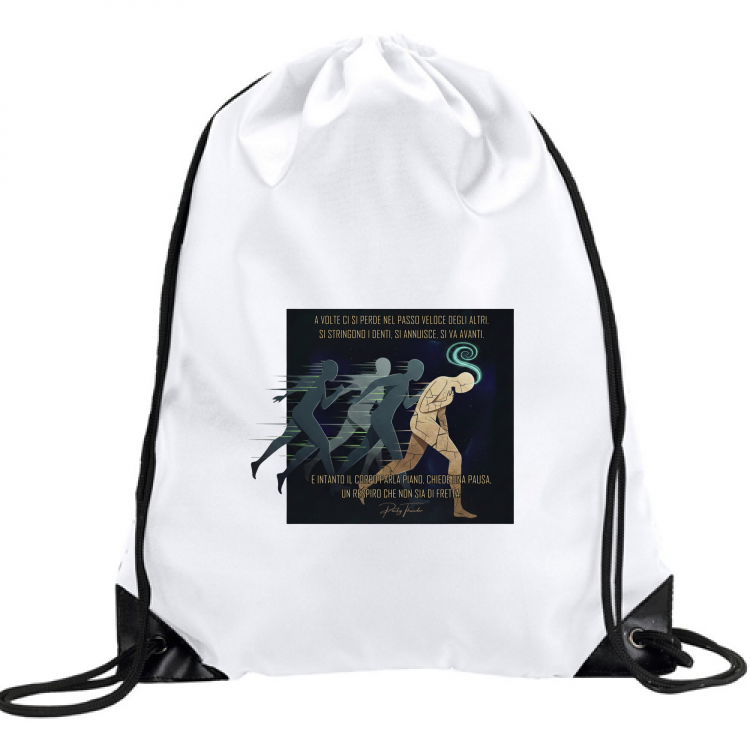 Polyester sports backpack measuring about 35x45 cm with black shoulder strap.