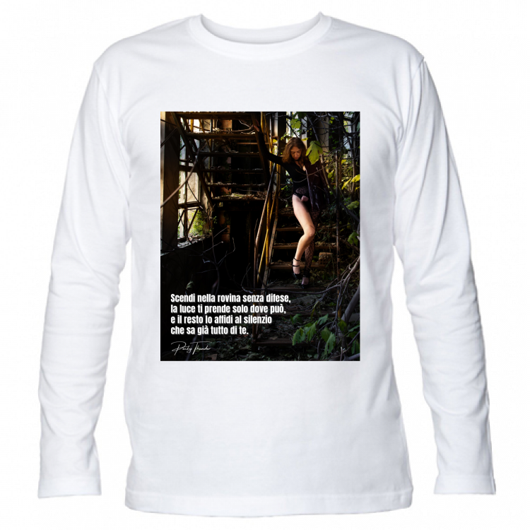 Soft long-sleeve t-shirt with a simple cut, in soft Ringspun semi-combed cotton. Tubular fabric with reinforcing tape on the neck, cuffless sleeves with a delicate rib. Washable at 40 degrees.
